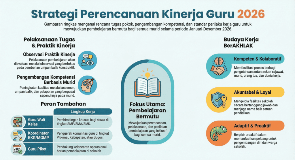 Dashboard kinerja berikut menggambarkan pelaksanaan tugas profesional guru sepanjang tahun 2026 yang meliputi kegiatan pembelajaran, aktivitas siswa, produk pembelajaran, dan dampak terhadap peningkatan kompetensi murid.